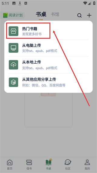 3、点击【+】后会弹出选项菜单,选择【热门书籍】可进入对应页面。