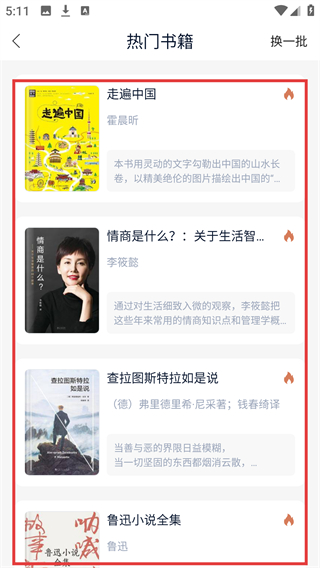 4、进入【热门书籍】页面,可查看【走遍中国】-【情商是什么?】等书籍,点击【换一批】能刷新推荐内容。