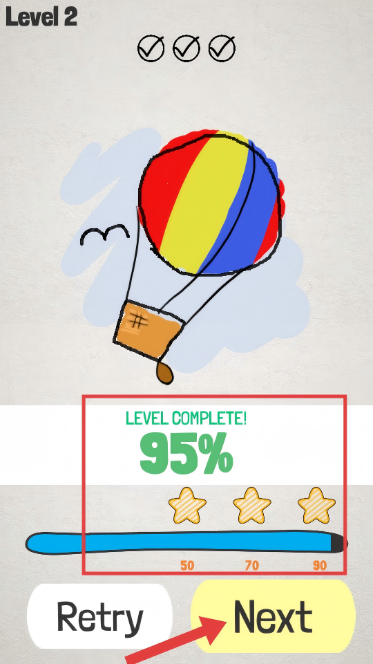 4、绘画结束后,查看红框内的【关卡完成度】和【星级评价】,点击【Next】按钮进入下一关。