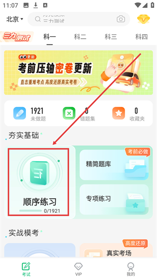 1、进入【科一】页面,点击【顺序练习】模块,可进入科目一练习页面。