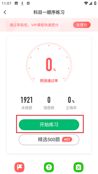2、进入【科目一顺序练习】页面,点击【开始练习】按钮,即可开启科目一题目练习。