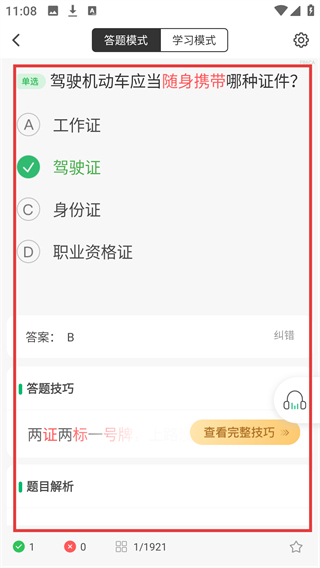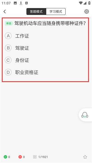 3、进入答题页面,当前为【答题模式】,需作答“驾驶机动车应携带哪种证件”的单选题,可选择对应选项完成答题。