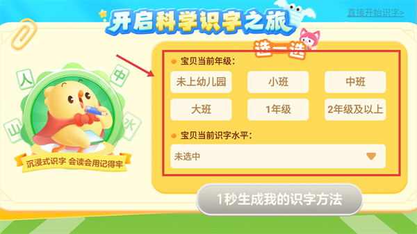 2、选择【宝贝当前年级】和【宝贝当前识字水平】。