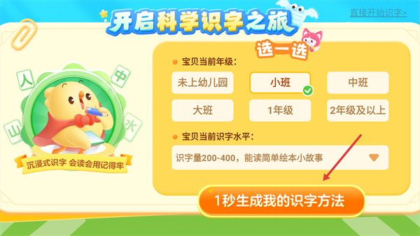 3、选好后,点击【1秒生成我的识字方法】按钮,生成专属识字方案。