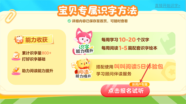 4、进入【宝贝专属识字方法】页面,点击【点击报名试听】参与学习服务。