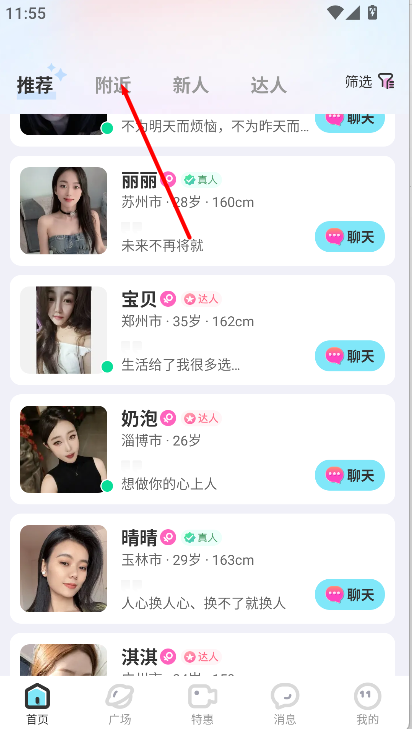 2、在首页界面中还可切换至“附近的人”功能版块,查看周边活跃成员的信息,支持浏览资料与发起互动,增强社交联系。