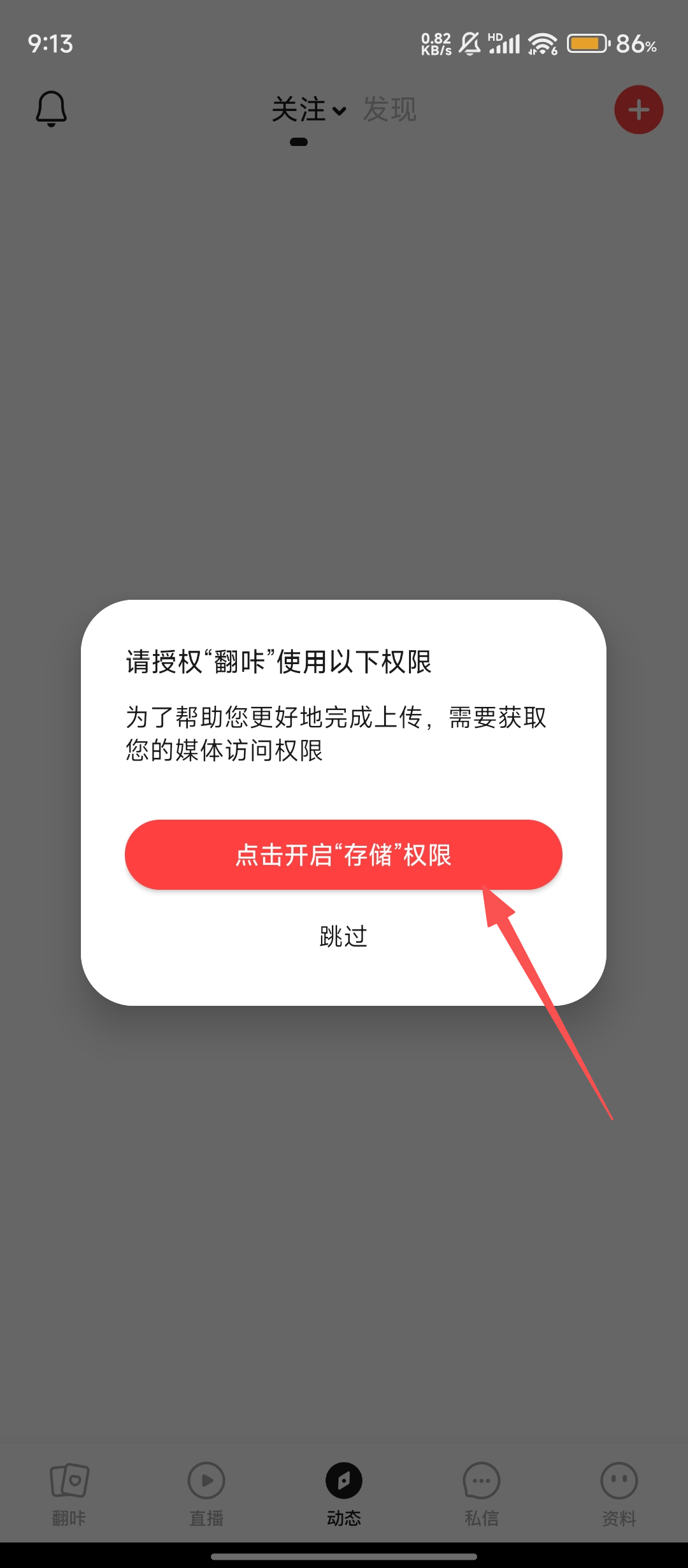 3、此时会弹出权限申请,为了顺利上传内容,记得点击开启【存储】权限,这步可不能省哦。