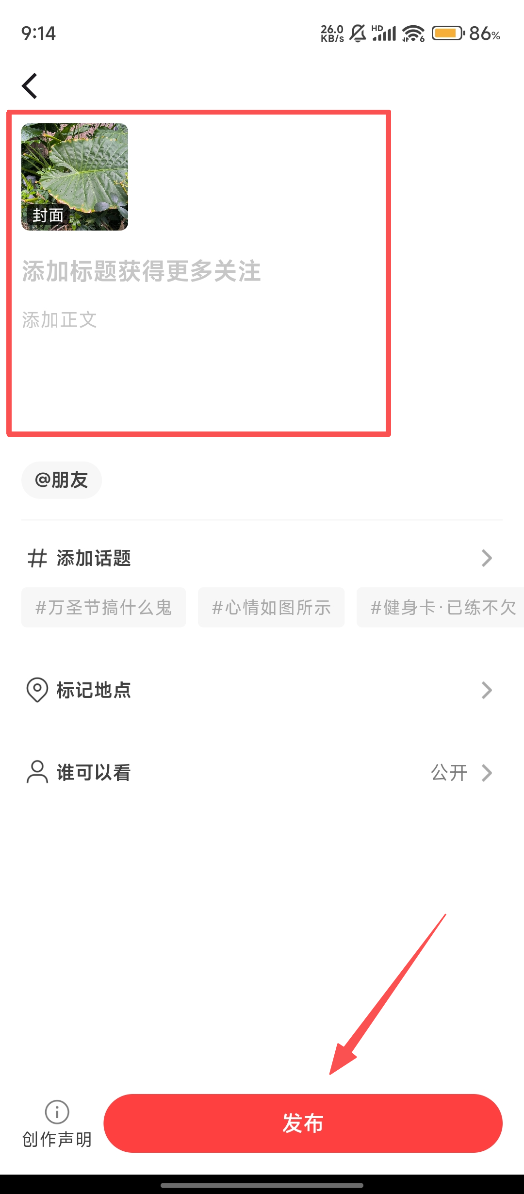 4、编辑好封面、标题、正文等内容后,点击底部【发布】按钮,你的动态就成功分享出去啦。