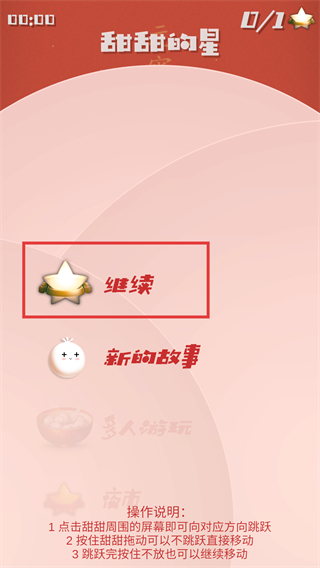 1、进入游戏主界面,选择【继续】,通过点击或拖动【甜甜】完成跳跃与移动操作。