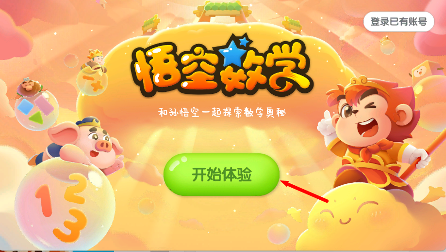 1、打开悟空数学APP,点击首页中的“开始体验”按钮,进入学习内容选择界面。