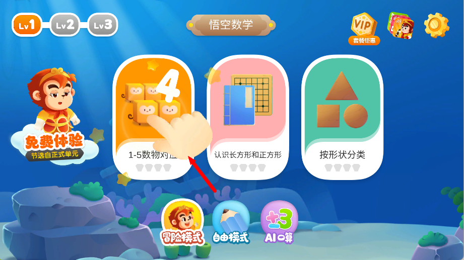2、按照系统提示,选择第一个学习模块“1-5的数物对应”,开始对应练习。