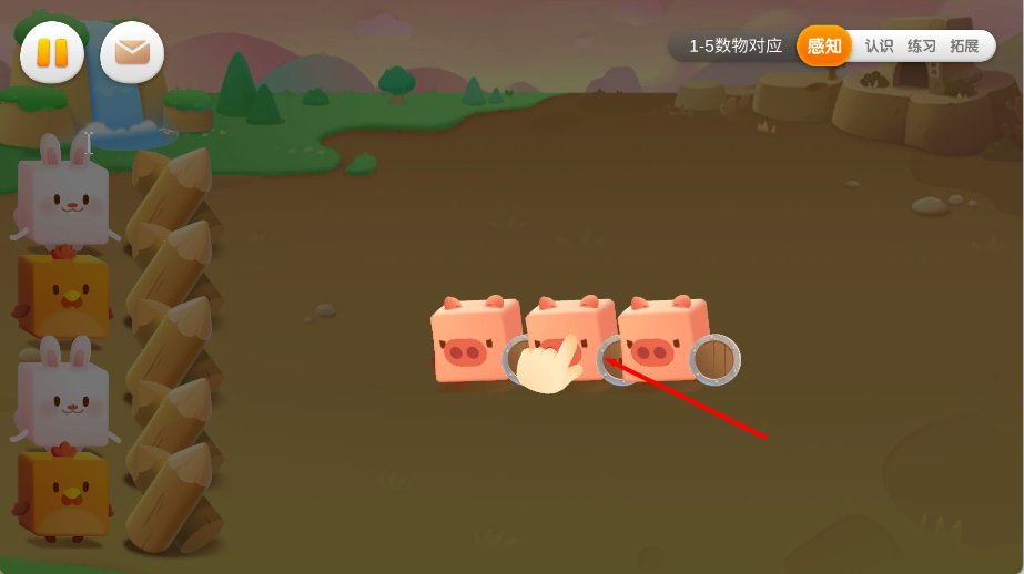 3、在练习页面,点击屏幕上显示的3只可爱小猪,进行数字与数量的匹配操作。