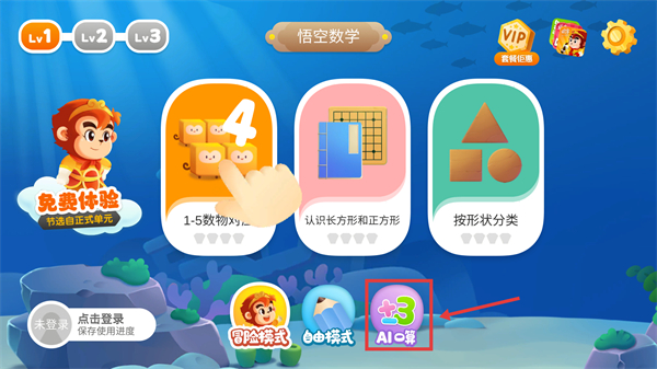 1、进入【悟空数学】界面,点击下方【AI口算】按钮进入对应功能,点击登录可保存使用进度。