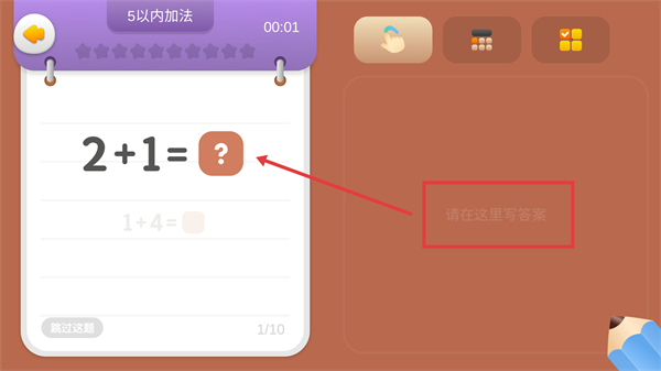4、在【5以内加法】练习页面,遇到【2+1=?】这类题目,需在“请在这里写答案”区域输入结果,完成题目推进练习。