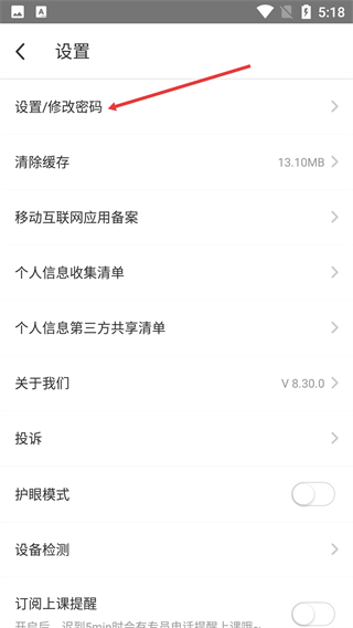 3、在设置页面,找到【设置/修改密码】选项,点击进入密码管理页面。