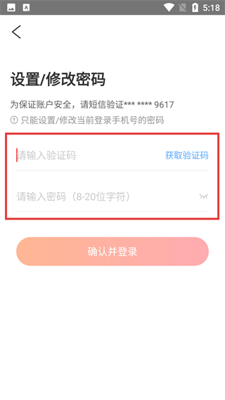 4、进入【设置/修改密码】页,需获取并输入验证码,填写新密码后点击【确认并登录】完成操作。
