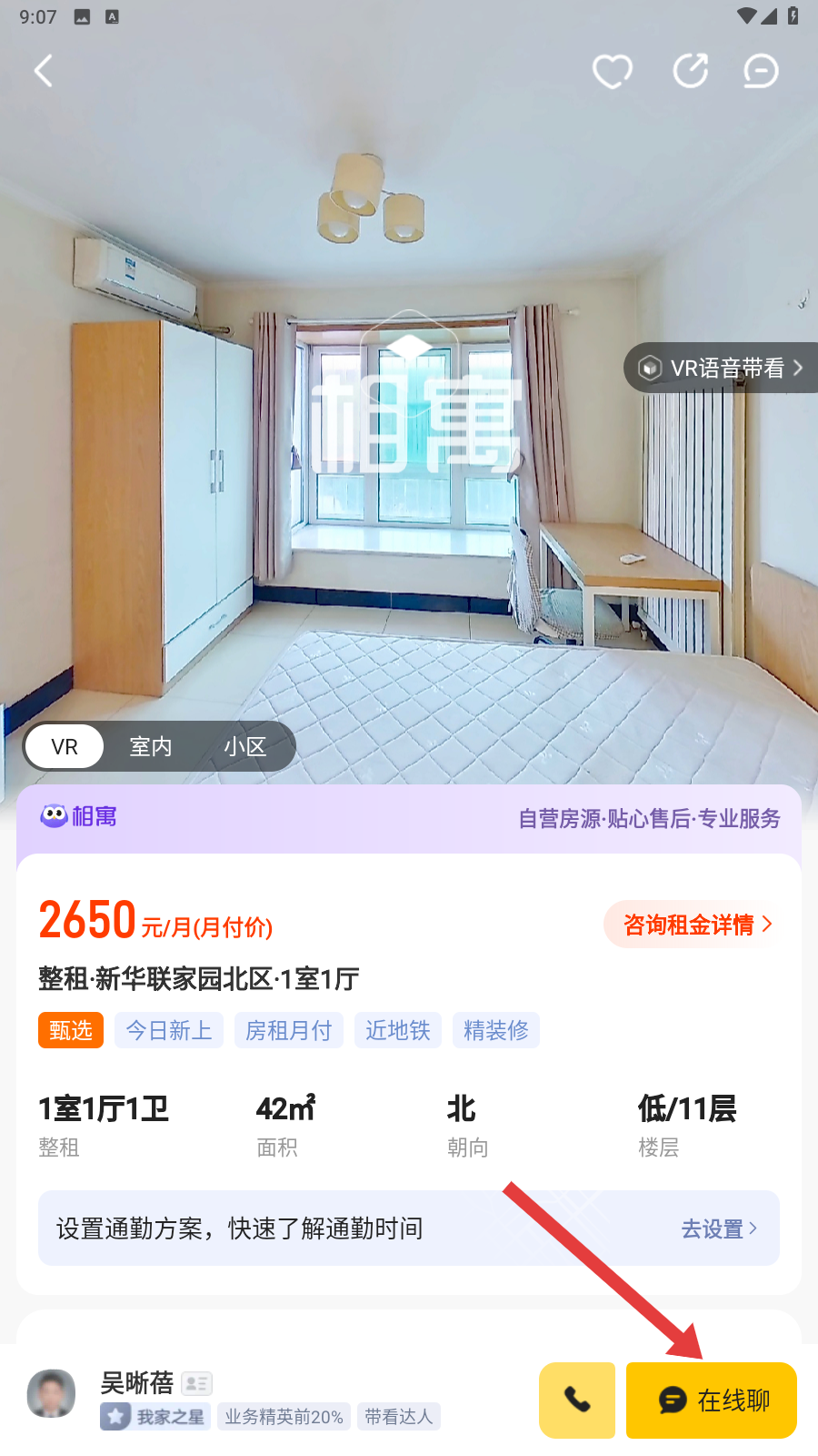 3、看中房源后,进入详情页可了解租金、户型等信息,若有疑问,点击【在线聊】,就能和经纪人实时沟通。