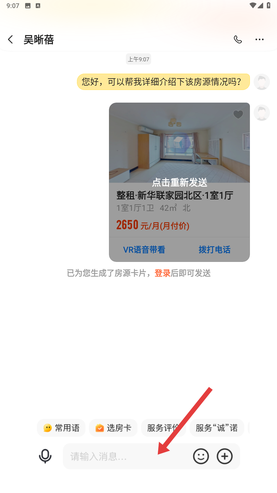 4、在聊天界面,可在输入框输入消息,和经纪人深入交流房源细节,也能发送房源卡片,让租房咨询变得更加顺畅呢。