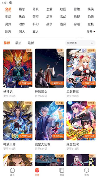 3、多种漫画分类:热血、霸总、修真等二十余种分类,满足各类阅读喜好。
