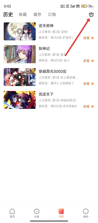2、在漫客栈的书架页,点击右上角的删除图标,进入选择界面啦。