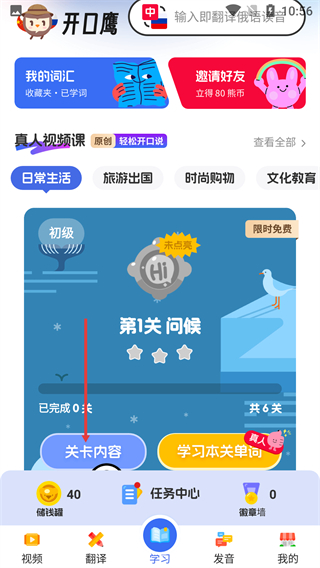 1、在学习页面,选择【第1关-问候】板块,点击【关卡内容】按钮,可进入对应课程的学习流程。