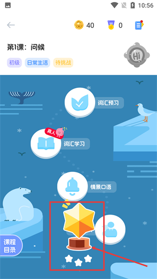 2、进入【第1课-问候】页面,能看到【词汇预习】【词汇学习】等学习模块,点击徽章区域可触发测试挑战。