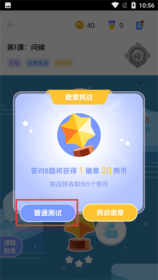 3、触发【徽章挑战】弹窗后,选择【普通测试】按钮,无需消耗熊币即可参与测试。