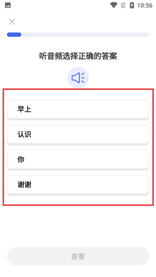 4、进入测试题页面,需听音频选择正确答案,选项含【早上】【认识】等内容,完成后可查看答题结果。