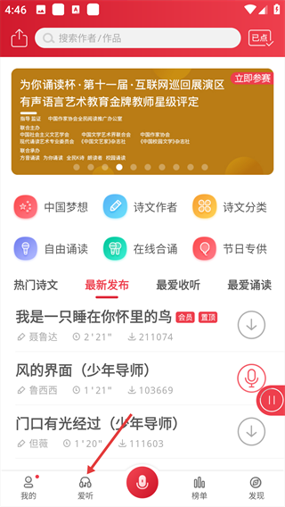 3、支持合诵互动功能,便于结识朗诵爱好者,共同完成诗词诵读内容的创作与交流。