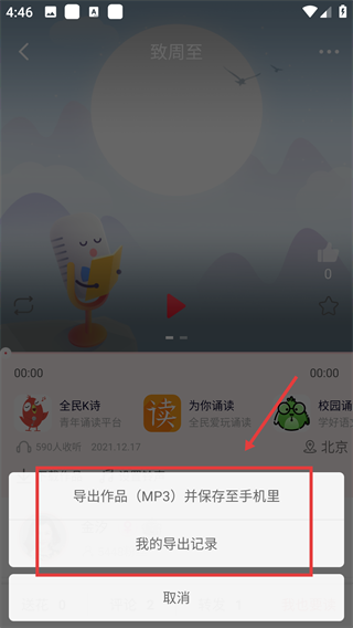 4、在弹出的菜单中,选择“导出作品(MP3)并保存至手机里”,将该作品保存到设备中。