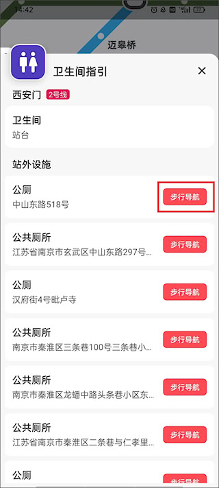 3、页面显示附近公告卫生间,点击右边步行导航可快速到达。