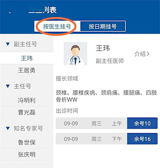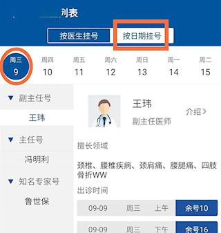 2、进入预约挂号选择科室,进入医生列表按医生或日期挂号。