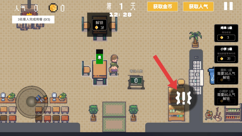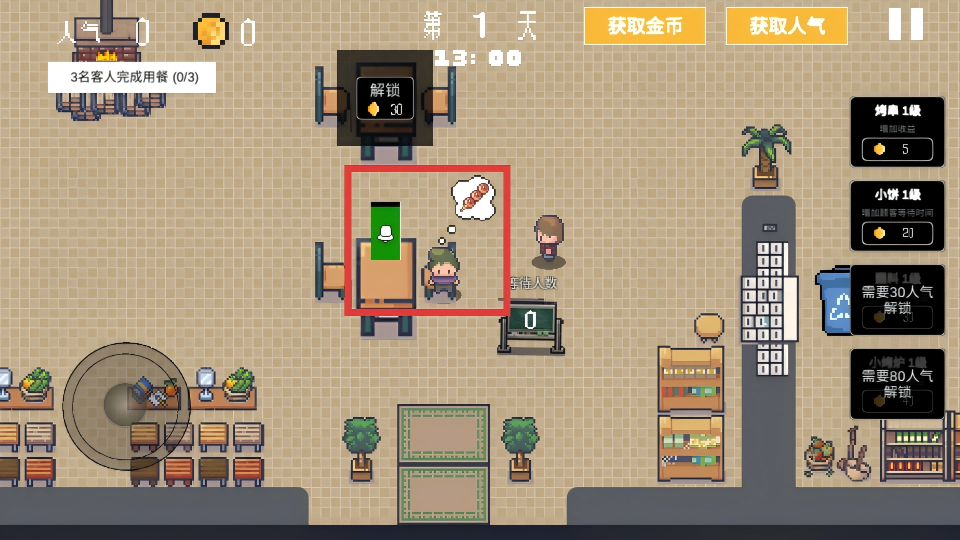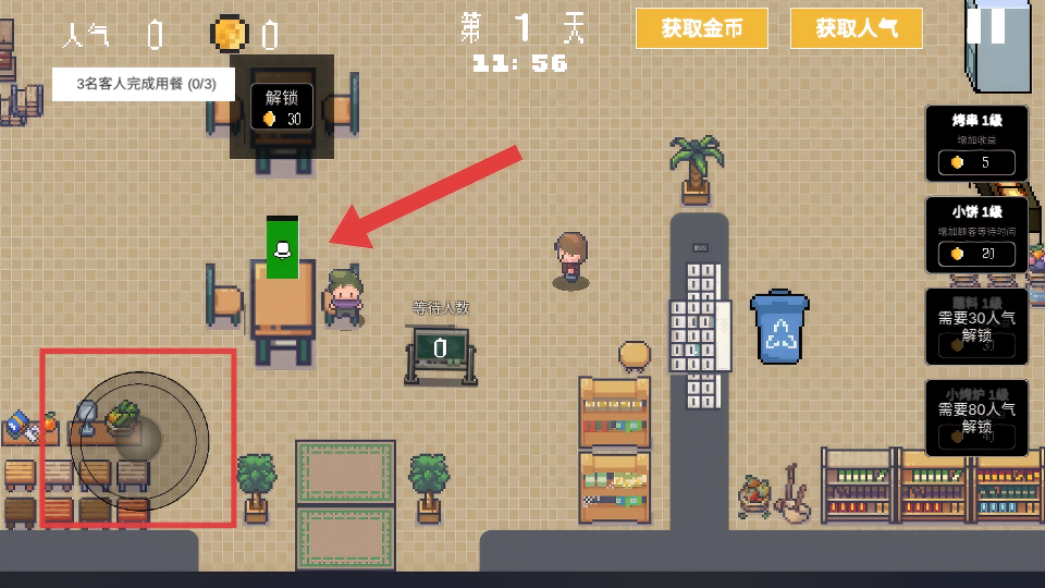 2、进入游戏看到【第-1-天】等信息,关注【3名客人完成用餐-0/3】任务,移动至顾客位置。