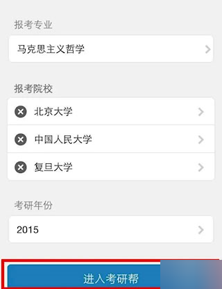 1、点击打开软件,需先完善资料,依次选择“报考专业”“报考院校”“考研年份”,最多可同时选三个报考院校。