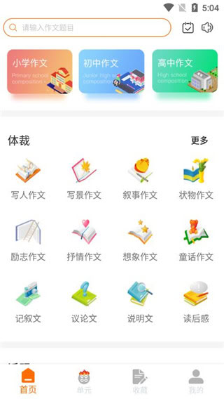 2、首页有小学作文、初中作文、高中作文等,各种题材作文都能在线阅读。