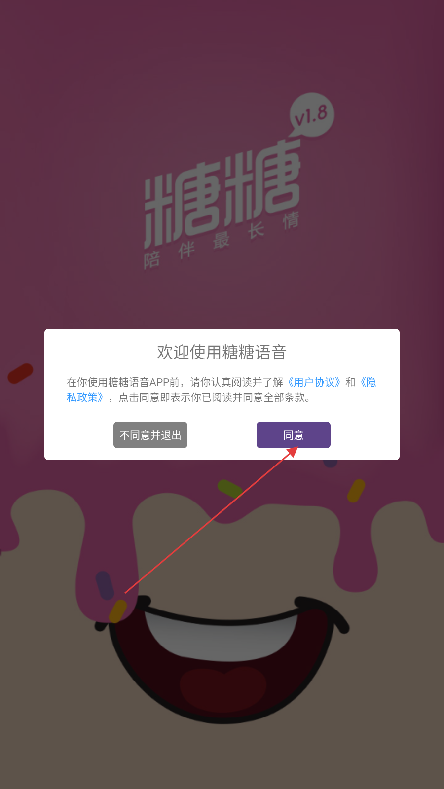 1、打开糖糖语音,阅读《用户协议》和《隐私政策》后,点击【同意】进入下一步。
