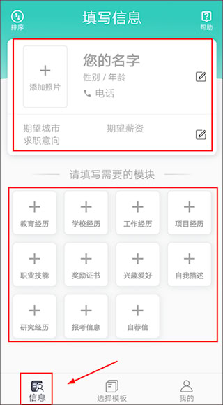 启动 app 后,在 “信息” 页面(即首页),填写个人的简历信息。