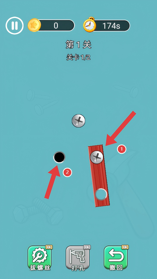 2、第二步点击【箭头1】螺丝,移动至【箭头2】位置,即可通关第一小关卡。