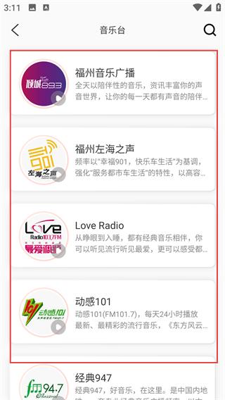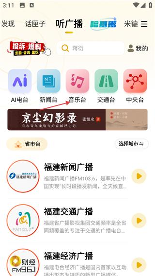 3、选择目标音乐广播(如【福州音乐广播】)并点击,进入该广播的播放界面。