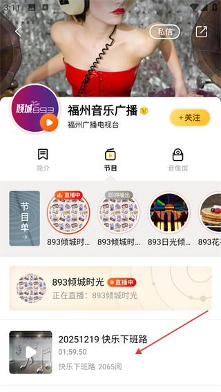 4、在播放界面找到节目(如【快乐下班路】),点击即可收听该广播节目。