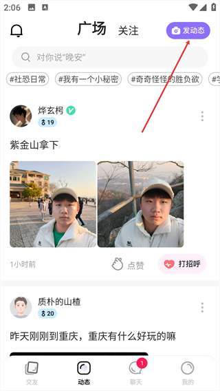 2、在【动态】广场页面,点击右上角的【发动态】按钮,进入动态编辑页面。