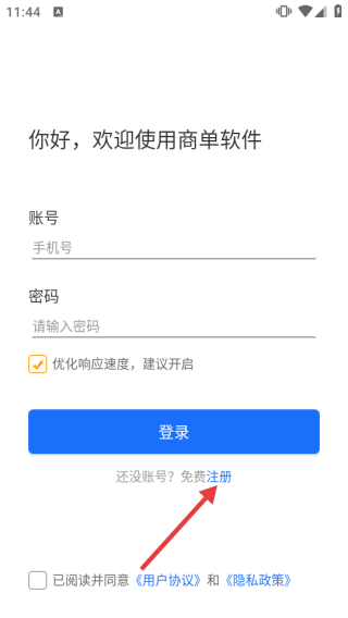 1、在商单软件登录页,点击【免费注册】进入注册信息填写页面。