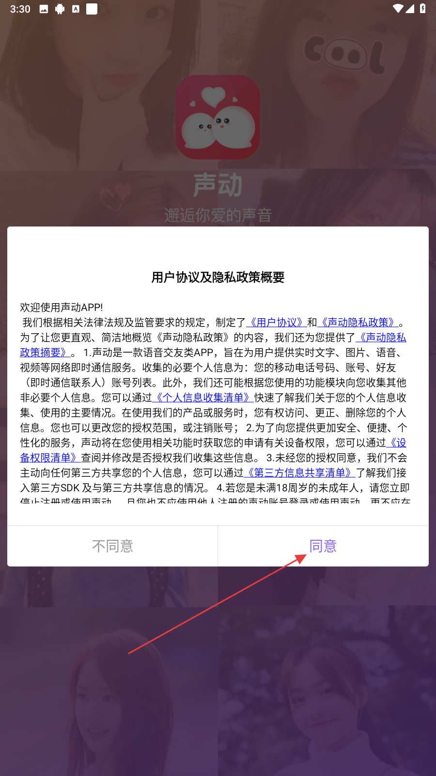 1、打开声动,阅读【用户协议及隐私政策概要】后,点【同意】继续。