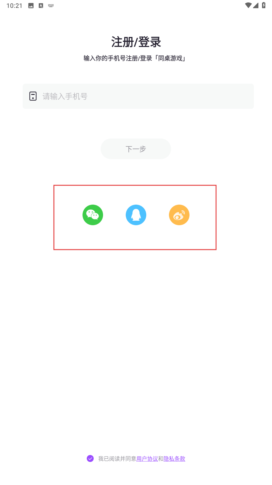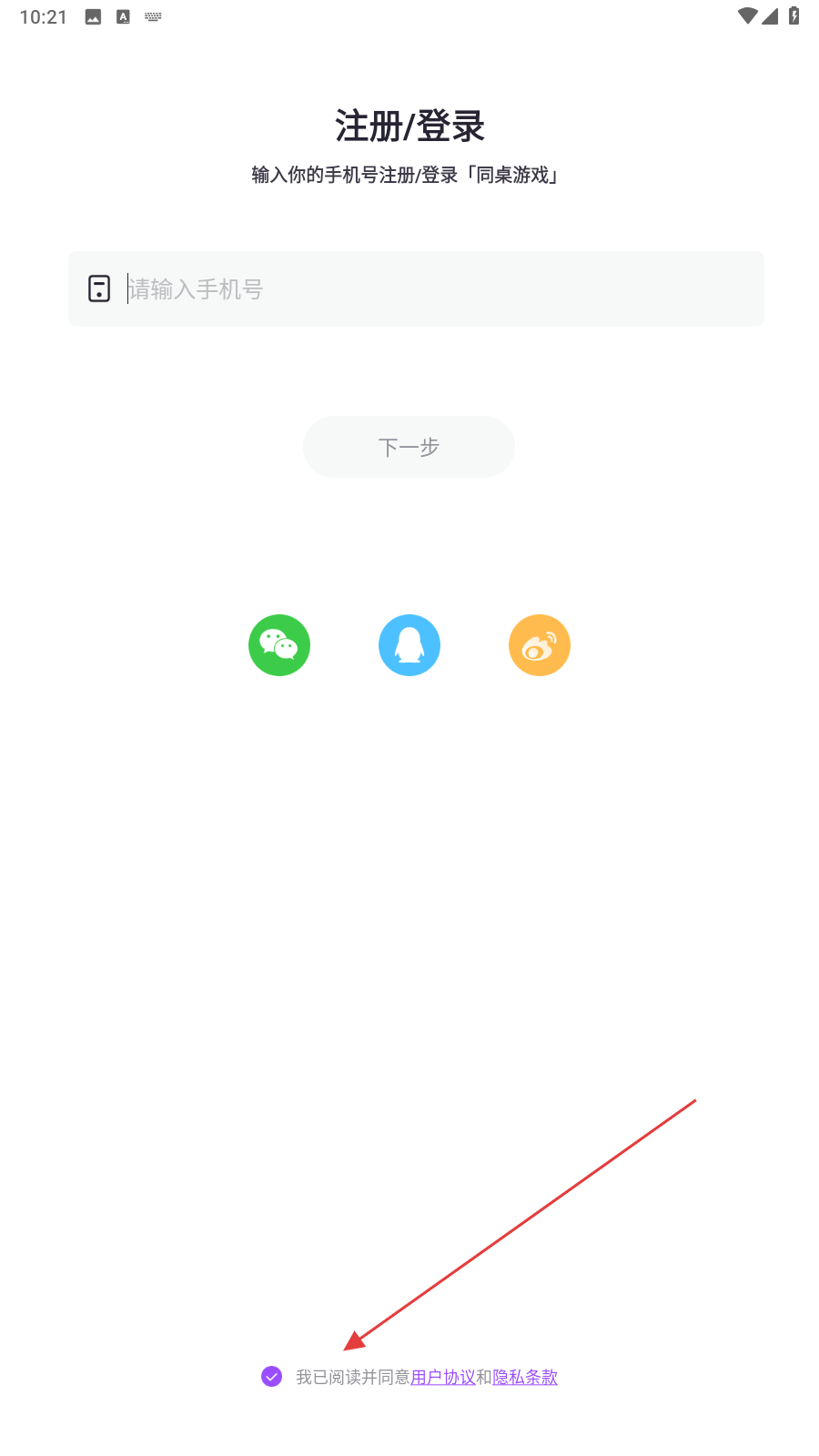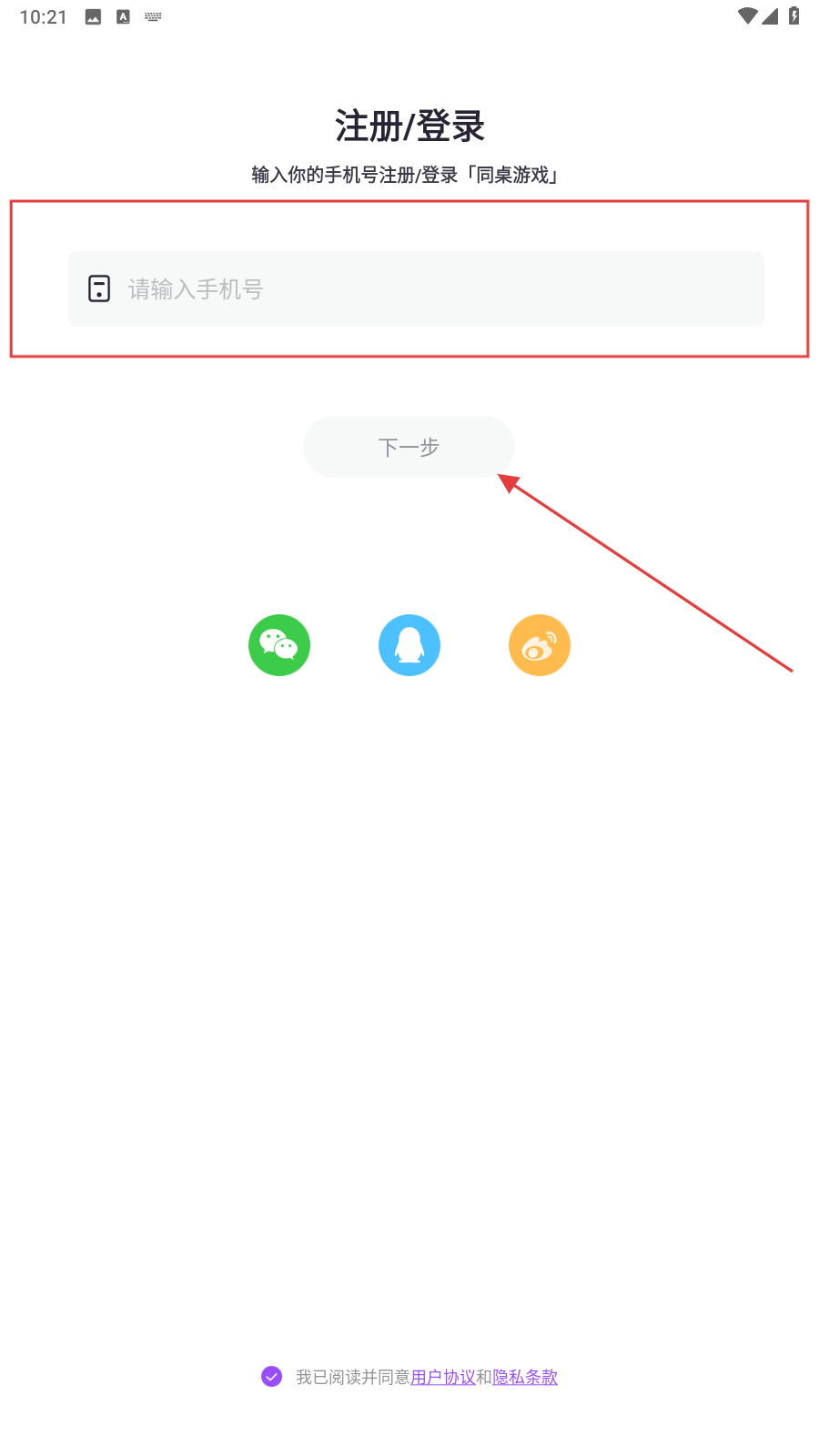1、先勾选【我已阅读并同意用户协议和隐私条款】,再填手机号点【下一步】完成注册/登录。