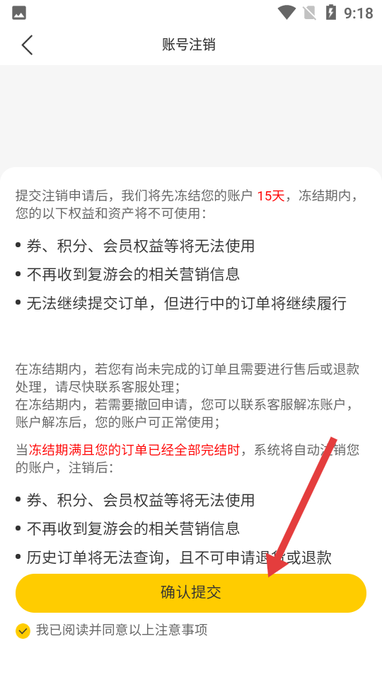 4、勾选同意注意事项后,点击【确认提交】,完成账号注销申请操作。