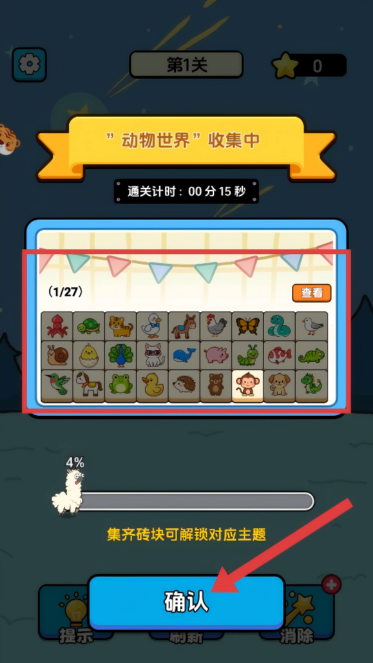 3、游戏中留意“动物世界”收集进度,集满【红框】内(1/27)的动物砖块,点击【确认】解锁主题。