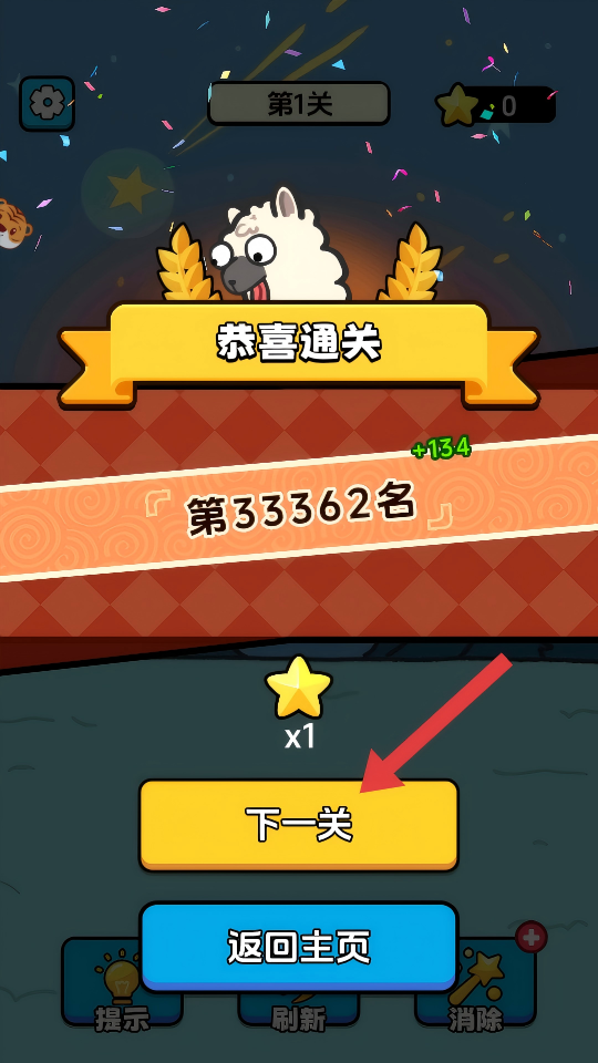 4、成功消除所有目标方块通关后,查看排名与奖励,点击【下一关】挑战新关卡。