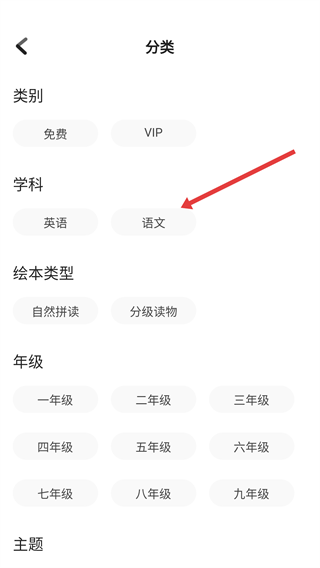 2、在分类页,选择【语文】学科来筛选对应内容呀。
