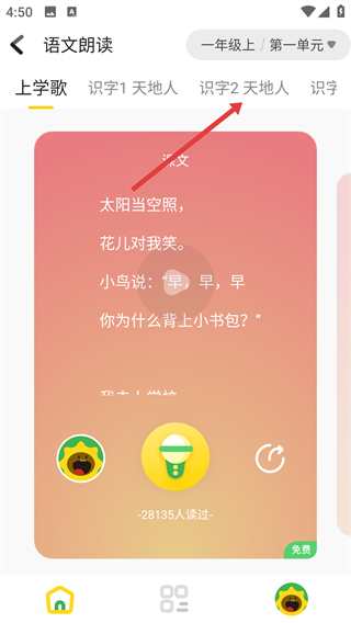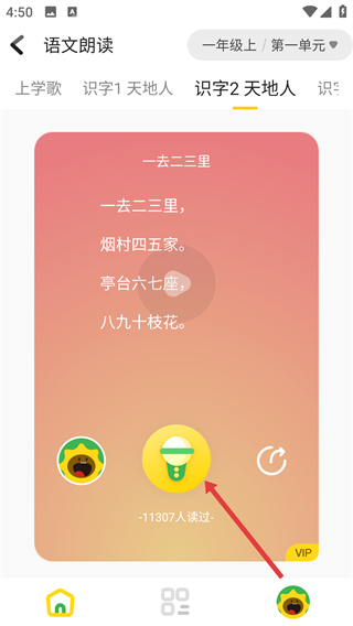 4、选好内容后,比如【识字2天地人】,点击麦克风按钮即可开始朗读练习啦。
