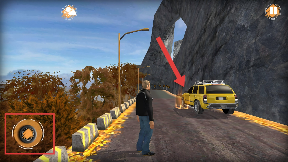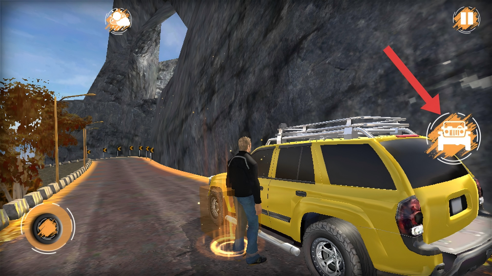1、进入游戏,通过点击红框内的【虚拟方向盘】按钮,操控角色走向【黄色越野车】。